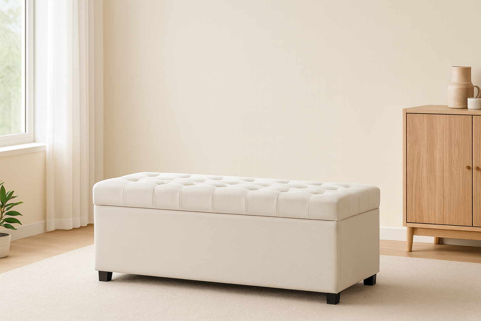 Keep blankets, pillows, and everyday essentials neatly tucked away while adding a cozy, modern touch to your bedroom with our tufted storage ottoman bench.